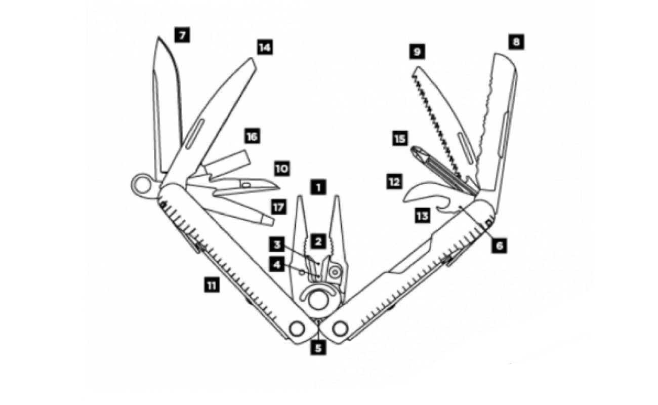 Инструмент с такими характеристиками сможет справиться с любыми сложными работами. Несмотря на малые размеры вместил в себя 17 инструментов. Владельцам понравятся 2 ножа из стали 420HC (серрейторный и обычный), напильник по металлу и дереву, эргономичные рукоятки модели, которые не позволяют устройству выпасть из руки. Производители подумали о безопасности, так что усилили фиксаторы на все опции, чтобы инструменты не смогли случайно закрыться. Долгий срок эксплуатации обеспечен за счет корпуса из нержавеющей стали. При желании предмет можно за стаховочное кольцо подвесить на ключи, рюкзак или экипировку.