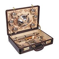 Дополнительная информация: комплект: 1. Тарелки - 3 штуки. 2. Стопки - 6 штук. 3. Вилки - 6 штук. 4. Шампура - 6 штук. 5. Мангал. 6. Нож разделочный. 7. Фляжка (0,45 л.). 8. Штопор. 10. Воронка. 11. Кейс - 1 шт.
