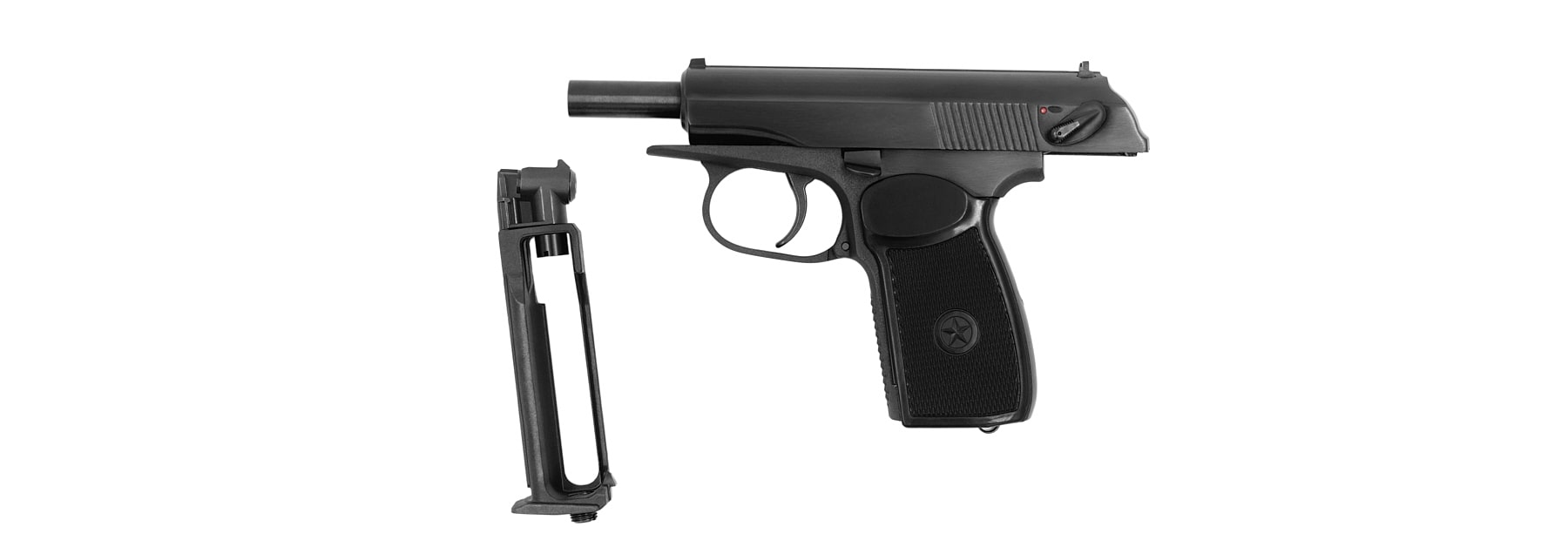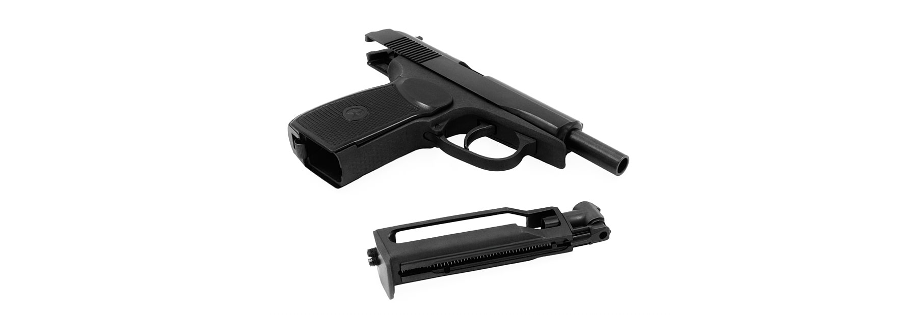 Пневматический пистолет создан на базе боевого пистолета Макарова ПМ и максимально аутентичен прототипу по внешнему виду, материалам, весу, габаритам, методике сборки-разборки и подготовке к стрельбе. Для стрельбы используются сферические 4,5 мм металлические пульки.