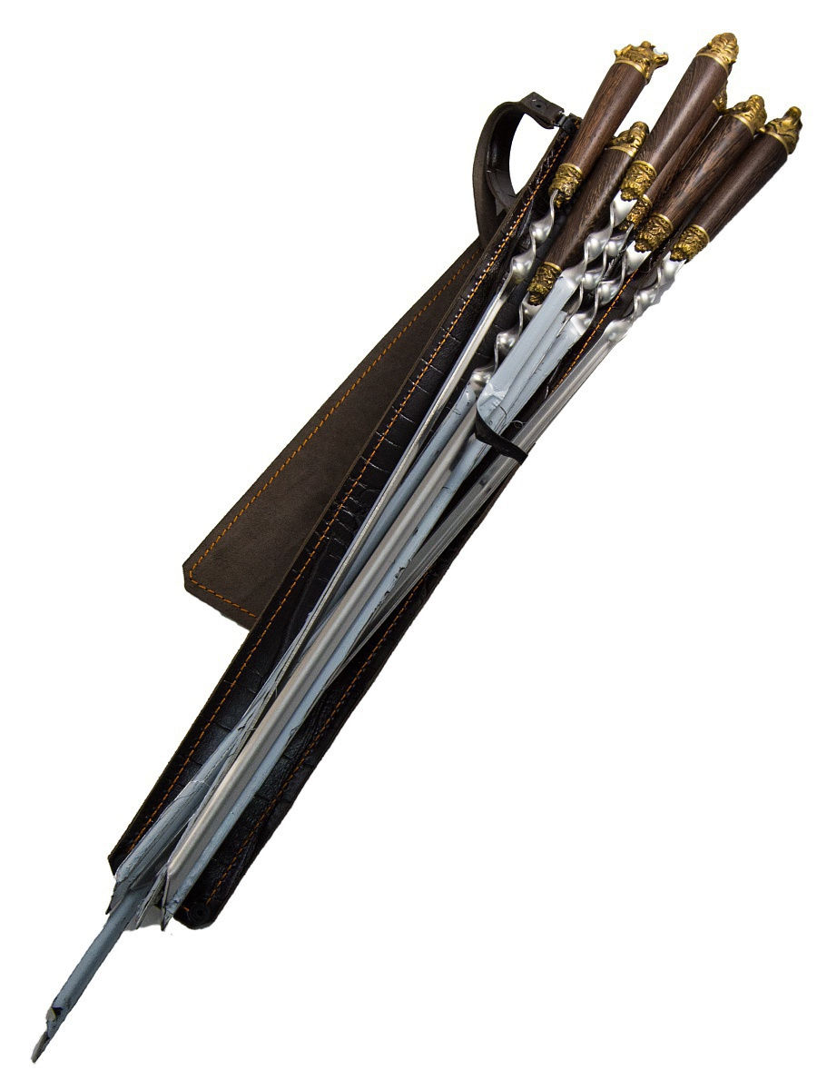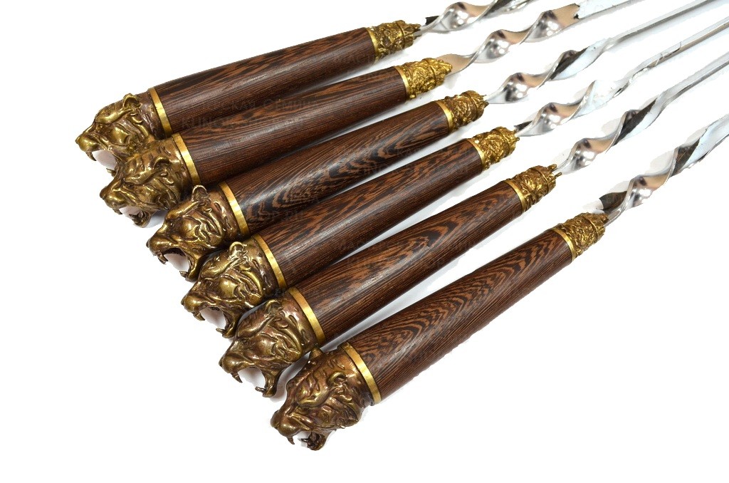 2. Шампура - 6 штук. Изготовлены из нержавеющей стали, с рукоятью из дерева венге и литья голов животных из латуни.