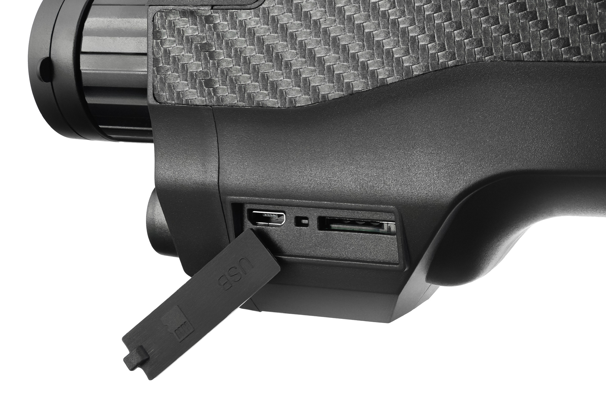В светлое время суток дальность наблюдений в монокуляр Levenhuk Atom Digital DNM100 ничем не ограничена, а ночью можно изучать окрестности в пределах 200 метров. Для стационарных наблюдений или съемки прибор может быть установлен на штатив с креплением 1/4". Встроенный рекордер дает возможность сохранять результаты наблюдений в формате фото и видео на карту памяти большого объема – до 128 ГБ. Рядом со слотом для карты расположен USB-выход. Максимальное разрешение фото достигает 4096x2160 пикс, видео записываются в Full HD.