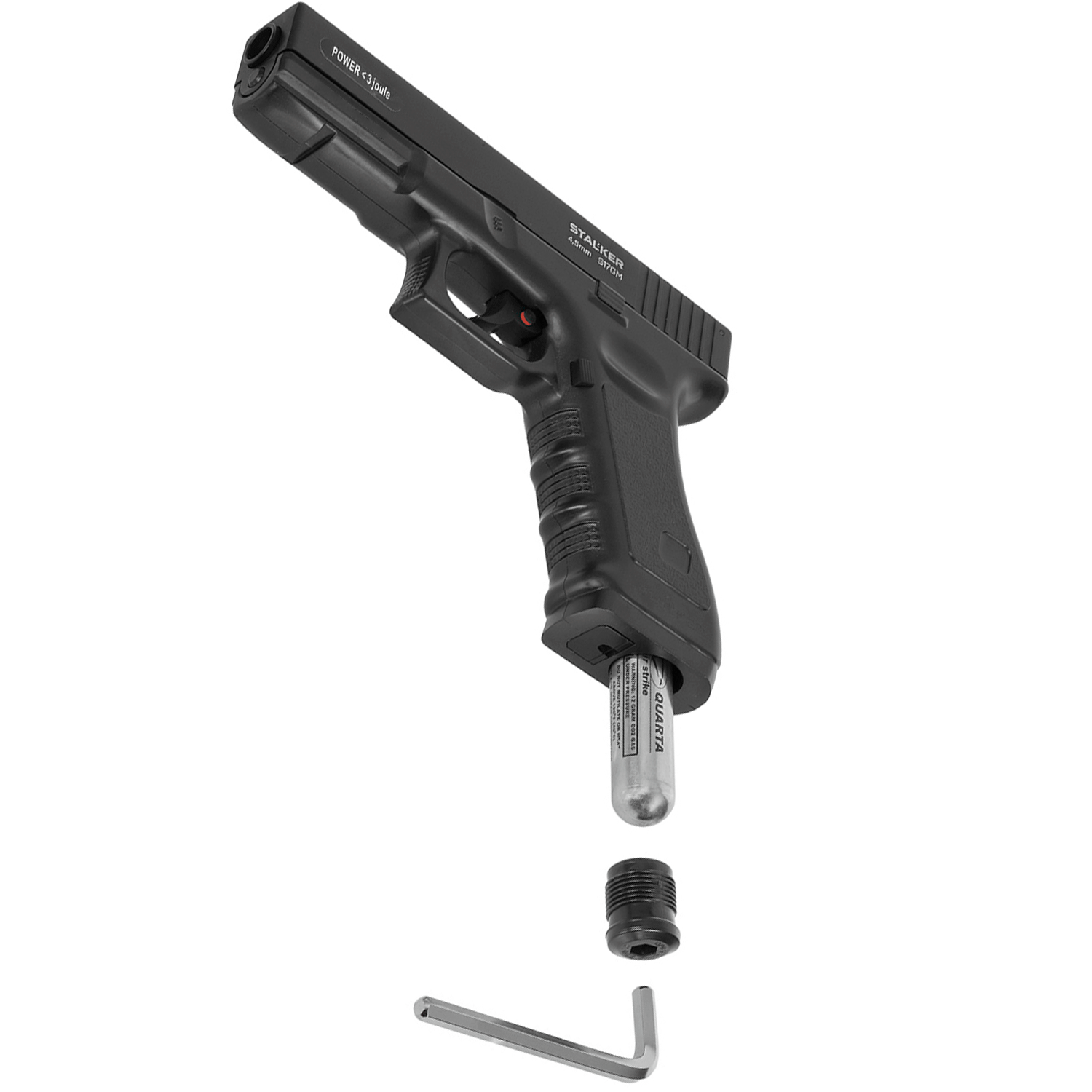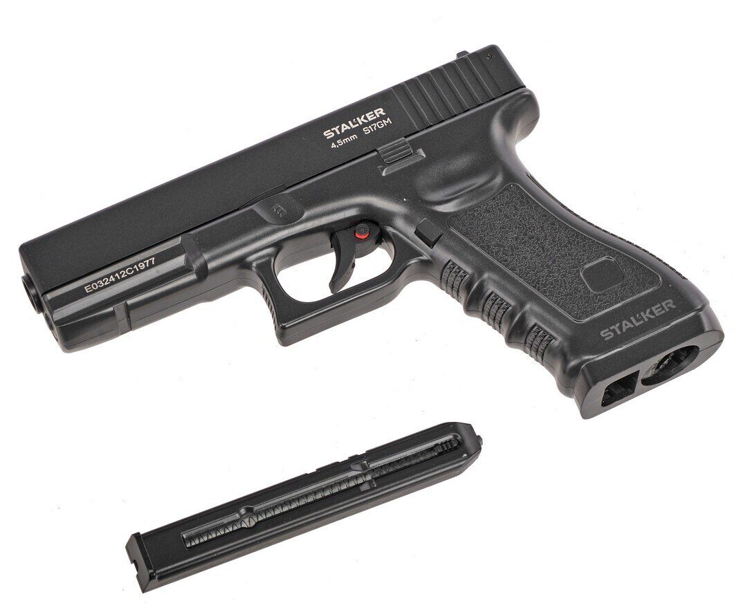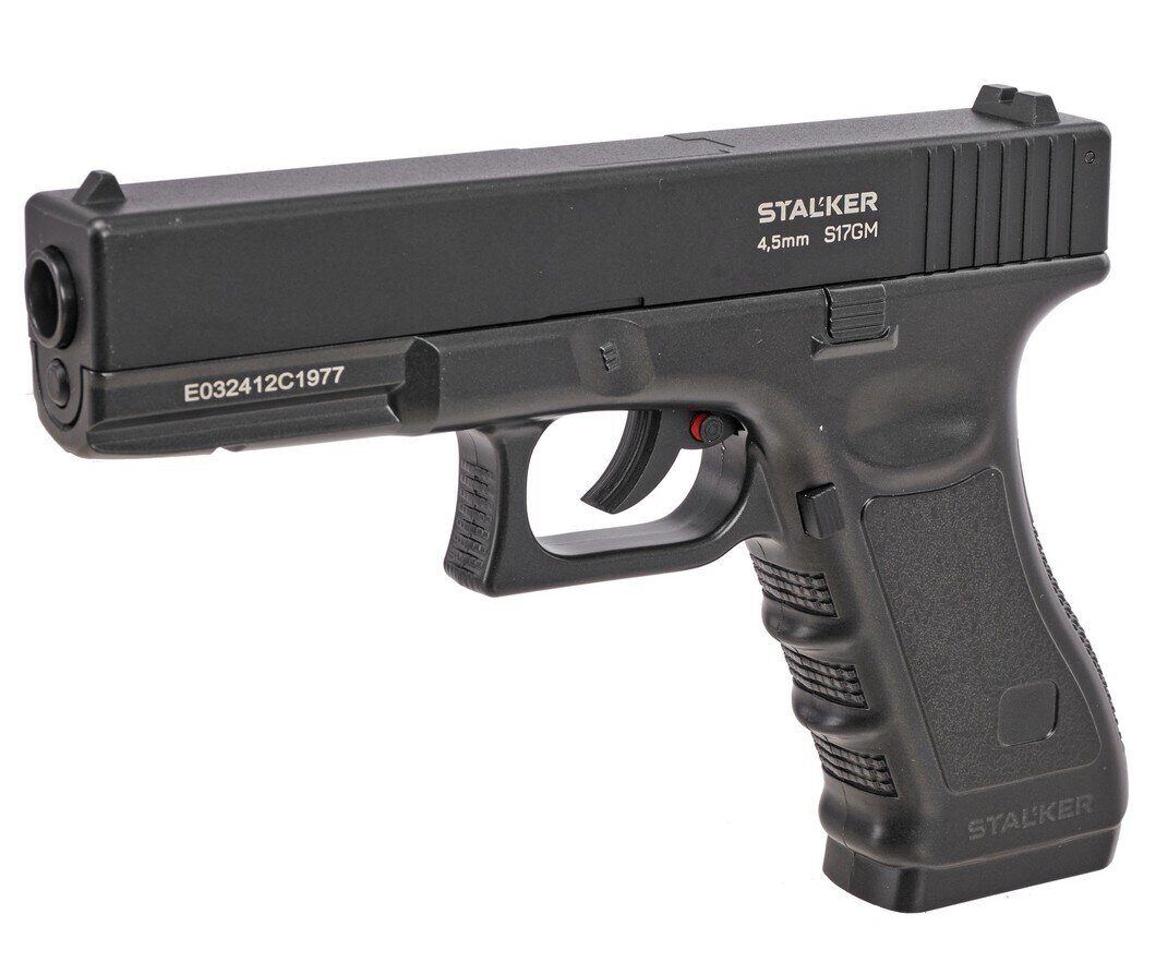 Пневматический пистолет S17GM от фирмы Stalker внешне копирует известную австрийскую модель Glock 17. Основное назначение пистолета - спортивно-развлекательная стрельба. В качестве источника энергии используются 12-граммовые баллончики с углекислым газом, а в качестве боепропасов - шарики ВВ калибра 4,5 мм. Скорость выстрела может достигать 120 м/с.