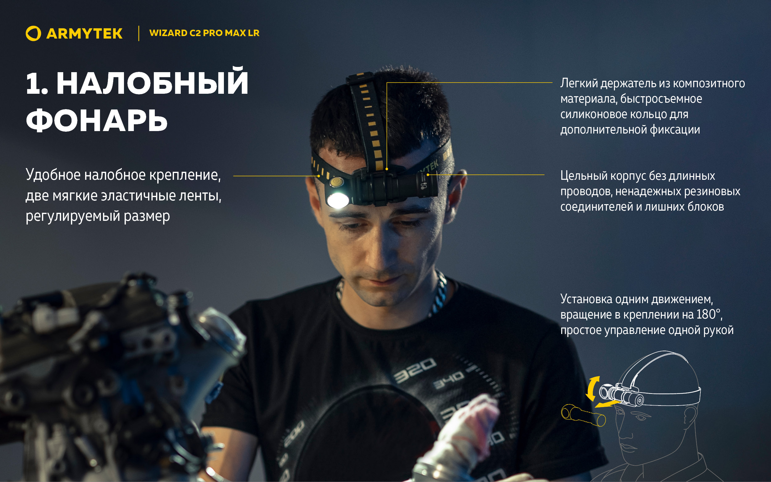Фонарь работает на комплектном аккумуляторе 21700 Li-Ion или на стандартном элементе питания 18650 Li-Ion с использованием адаптера. Налобное крепление, клипса, чехол, магнит в задней крышке и опциональное велокрепление ABM-01 обеспечивают несколько вариантов фиксации для комфортного ежедневного использования и занятий спортом. Для Wizard C2 Pro Max LR также предусмотрены оригинальные крепления на каску для индустриальных работ и альпинизма.