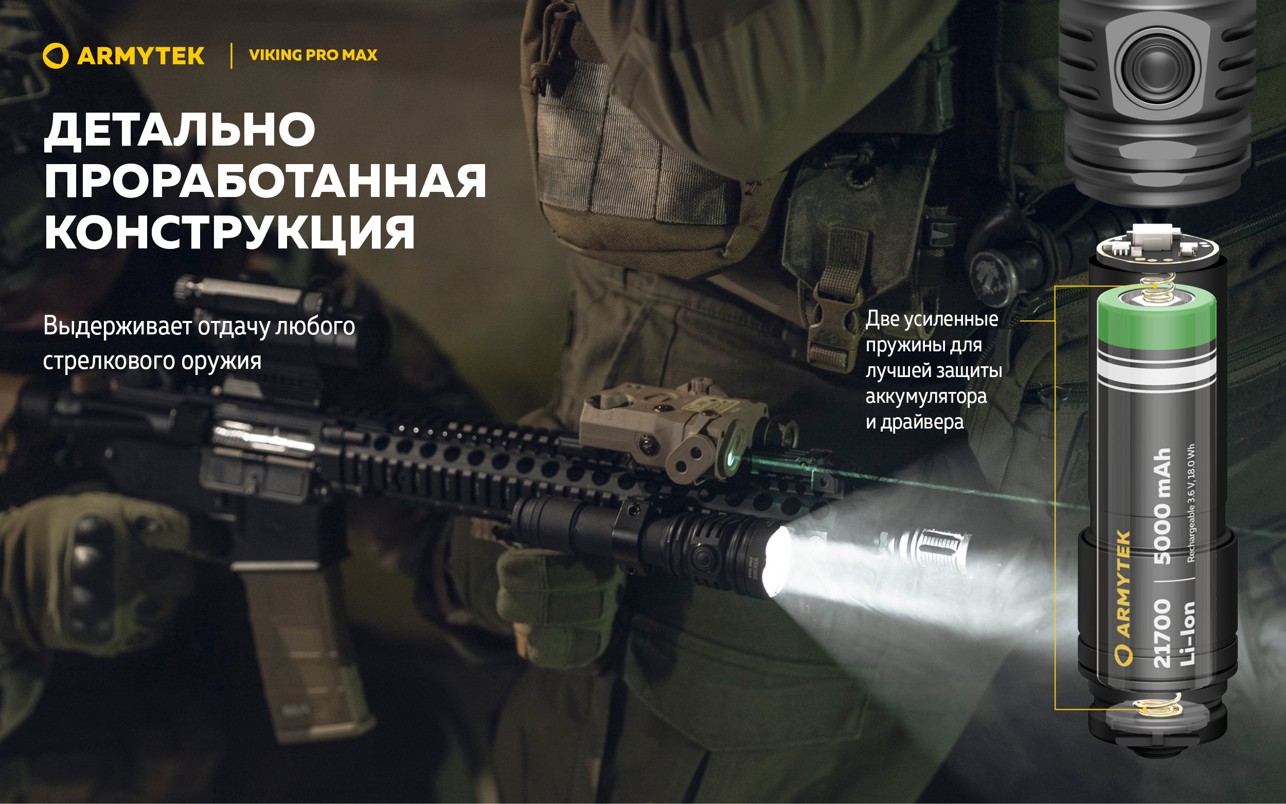 Viking Pro Max совместим со специально разработанной магнитной выносной кнопкой и оригинальными креплениями для подствольного применения. Модель работает не только на комплектном элементе питания, но и на любом стандартном аккумуляторе 21700 Li-Ion, а также, благодаря адаптеру, на аккумуляторе 18650 Li-Ion или на двух литиевых батарейках CR123A. Вариативность элементов питания позволяет значительно повысить автономность.