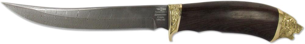 Описание БрендНожемир Россия Длина клинка, мм173 Толщина клинка, мм3,5 Общая длина, мм315 Материал рукоятивенге Художественное литьёлатунь Твёрдость стали, HRC62 Ножныкожа Стальдамаск