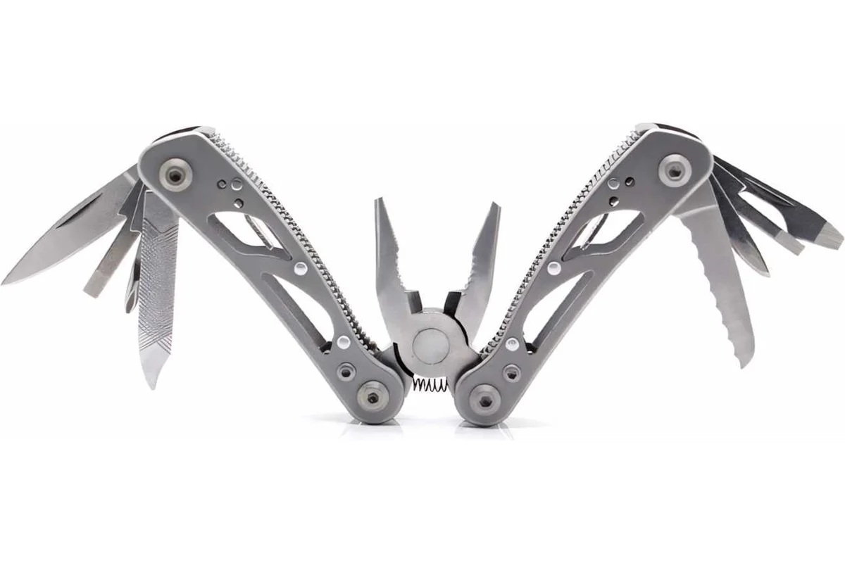 Функции: плоскогубцы, кусачки, средняя отвертка плоская, маленькая отвертка плоская, крестообразная отвертка, нож, серрейтор, открывалка для бутылок, для снятия изоляции, шило, пилочка для ногтей