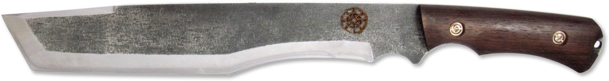 | Краткие характеристики: | длина 432мм/длина клин.300мм/толщина 4 мм/Сталь: 95Х18/твёрдость стали, 62 HRC/рук.дерево венге/чехол защ.кожа |