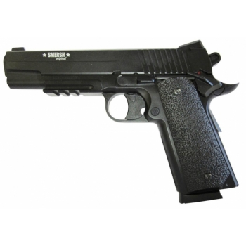 Smersh H 60 - недорогой, достаточно мощный и точный газобаллонный пистолет с неподвижным затвором. Данная модель отлично подойдет как для начинающего стрелка, так и для опытного эирганнера. Пистолет весьма достоверно копирует огнестрельный Sig-Sauer GSR, который, в свою очередь, является развитием легендарного пистолета Кольт модели 1911. Smersh H 60 стреляет только самовзводом. Имеется действующий предохранитель и подпружиненный фальшкурок, не играющий никакой роли в цикле стрельбы, но двигающийся при нажатии на спусковой крючок.