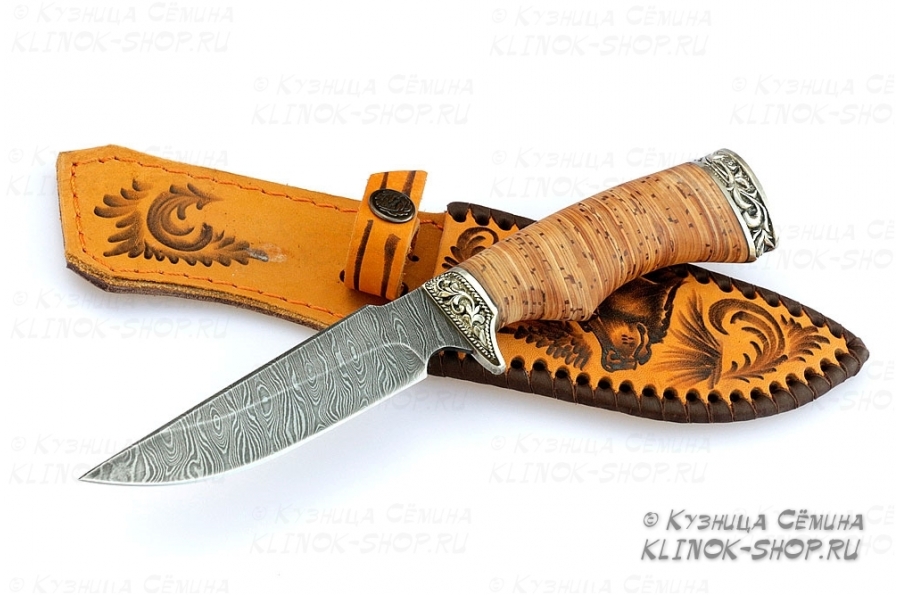 1. Нож из дамасской стали «Следопыт» - рукоять из бересты и мельхиора.