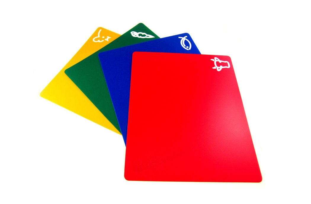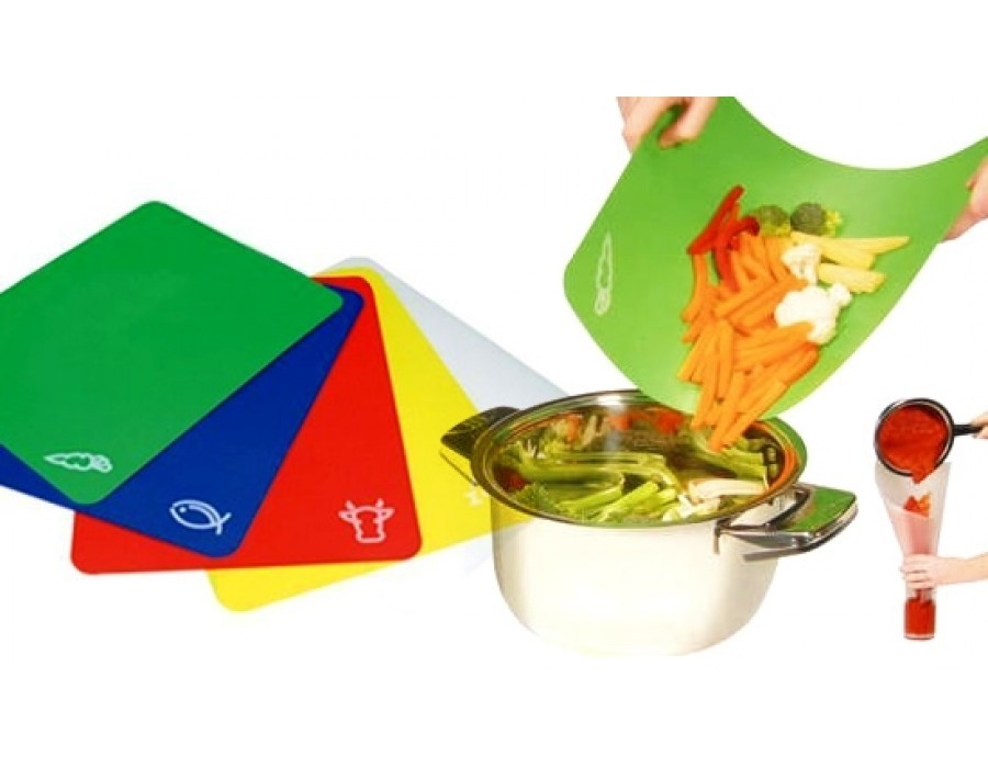 Набор из 4-х гибких досок. Доски изготовлены из специального пластика, легко гнутся и сворачиваются. Теперь овощи, фрукты и мясо попадут точно в тарелку или кастрюлю. Каждая доска промаркирована пиктограммой в углу и имеет свой цвет, поэтому вы не перепутаете доску для мяса с доской для рыбы или овощей. Доска не скользит по поверхности стола, она тонкая и легкая.